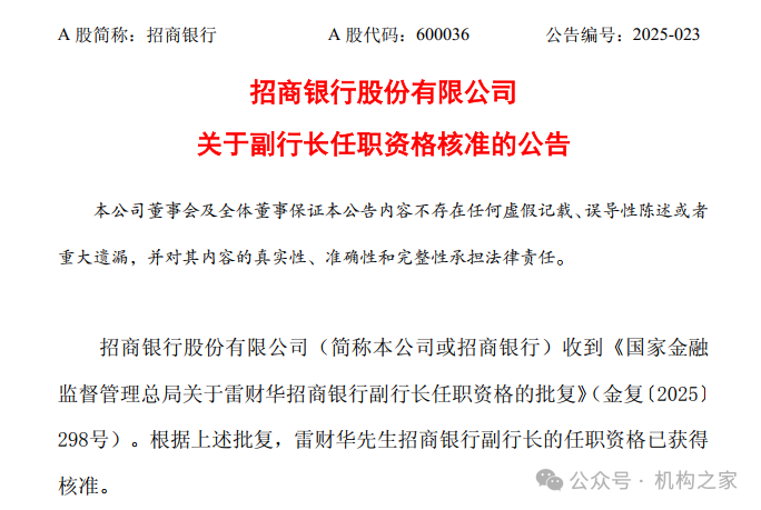 图片系招商银行公告副行长雷财华任职资格获批